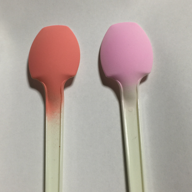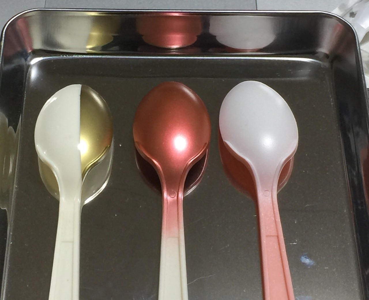 100均プラスプーンの白(というか乳白色に近い)とピンクにゴールド、メタレッド、ホワイトを吹いた。