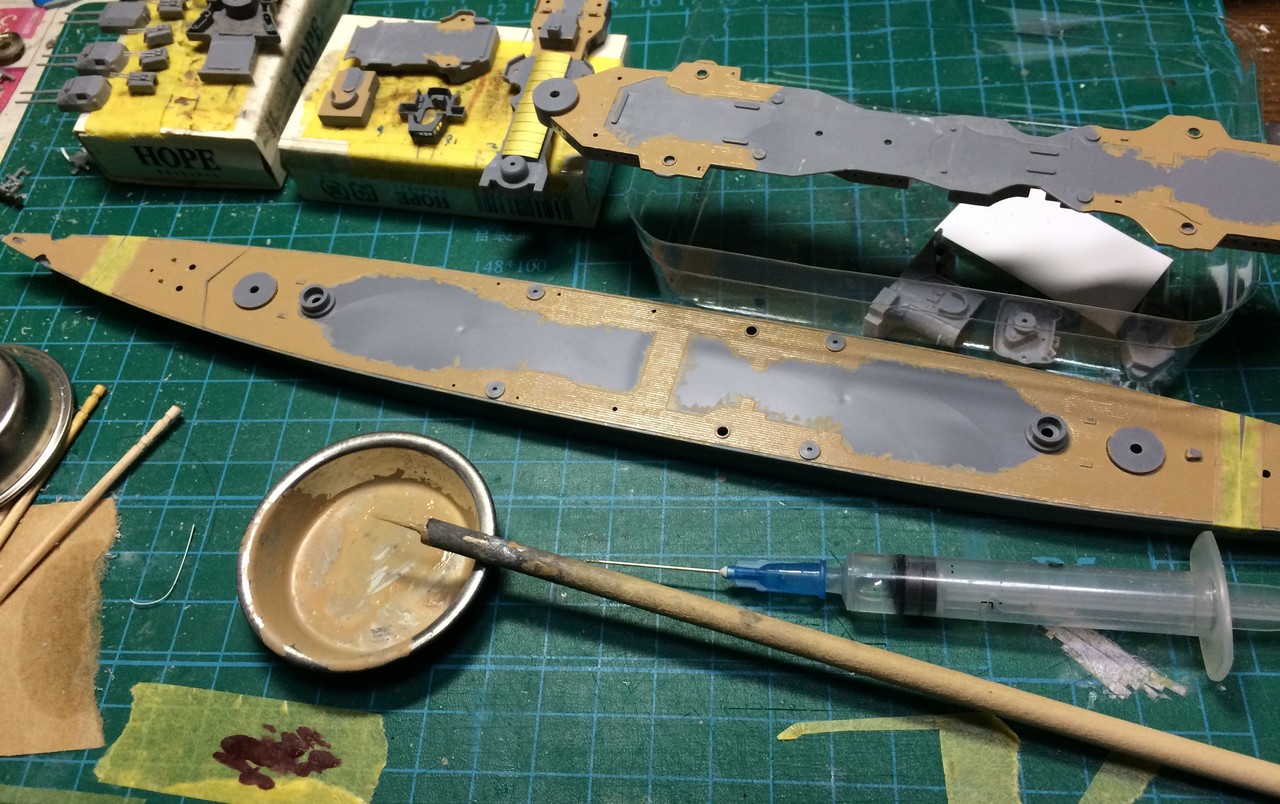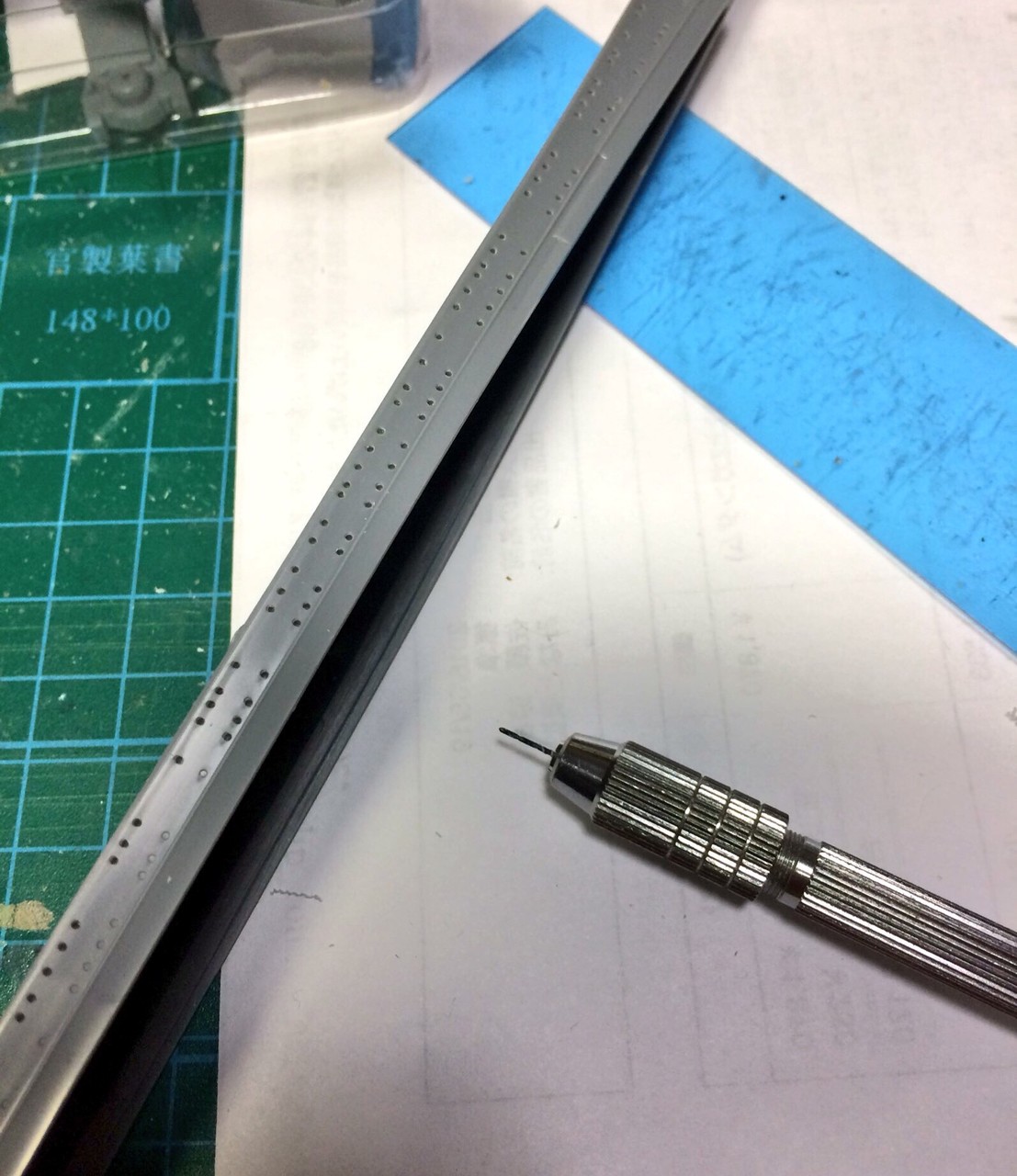 PrinzEugenさん進捗。やっと角窓全部空け終わった。0.5mm角くらいのノミが欲しいですね。