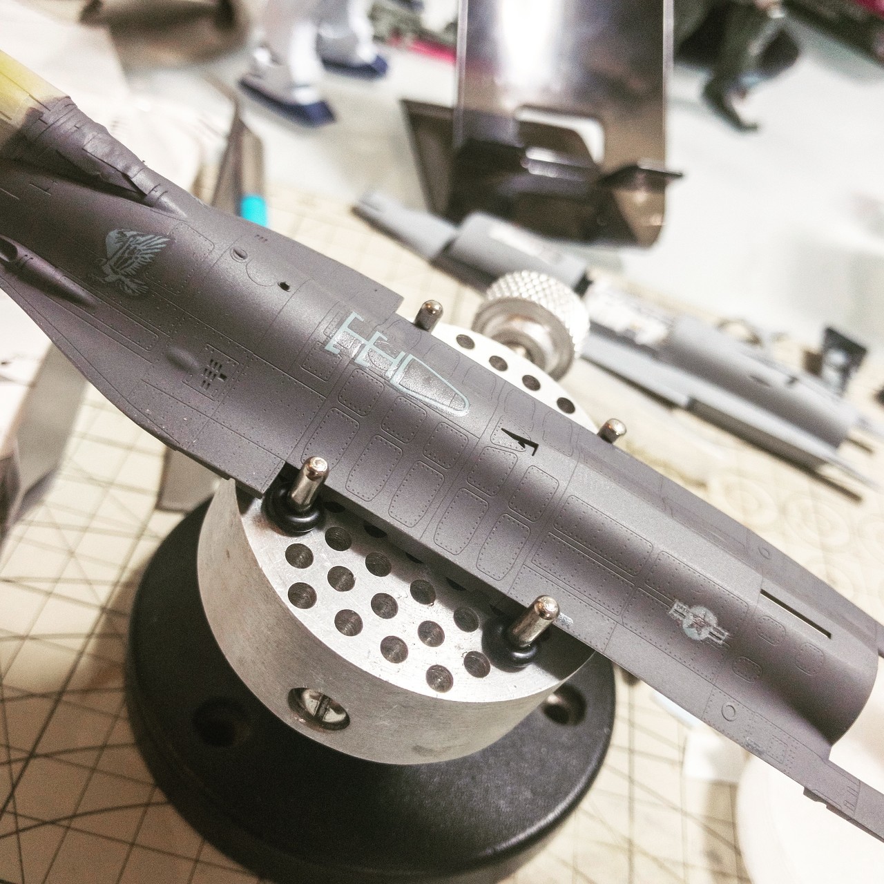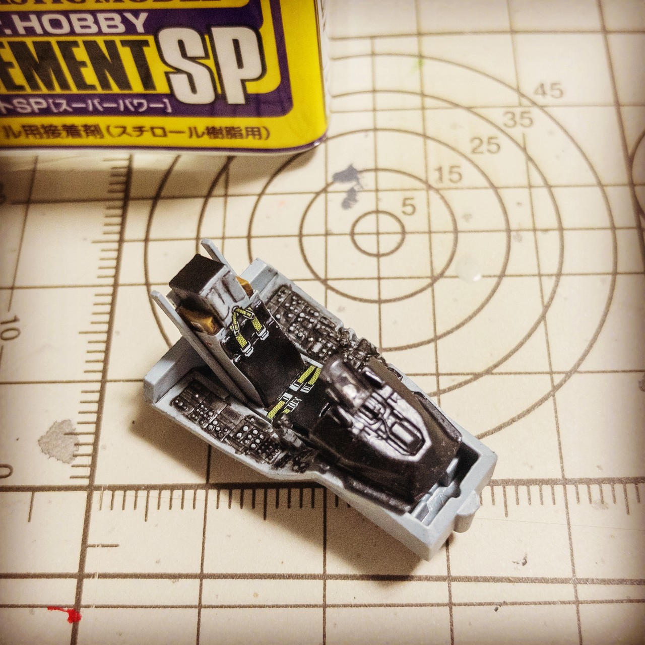 コックピットも挟み込み、胴体上下接着しました。基本塗装はあとエンジンのノズルくらいかな...