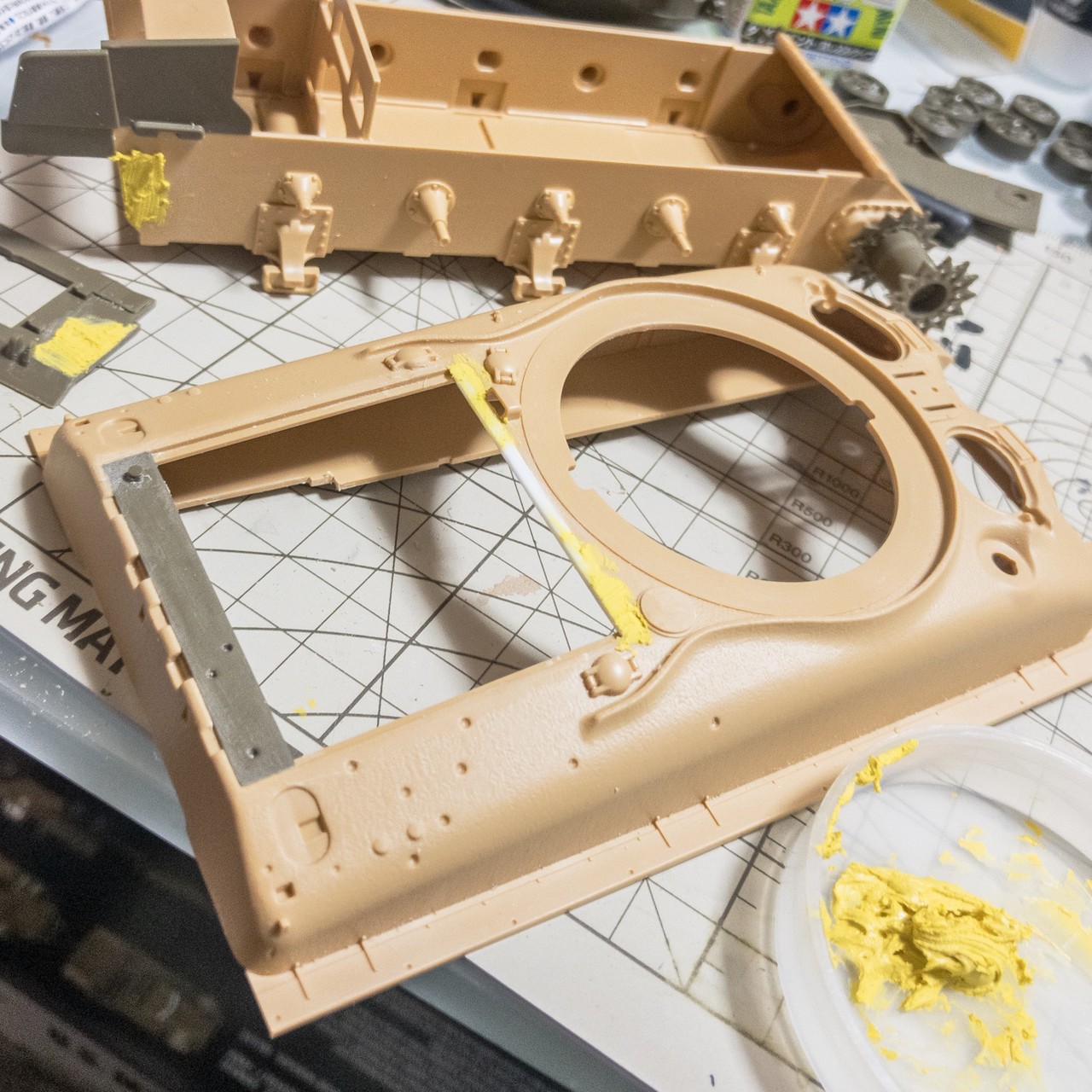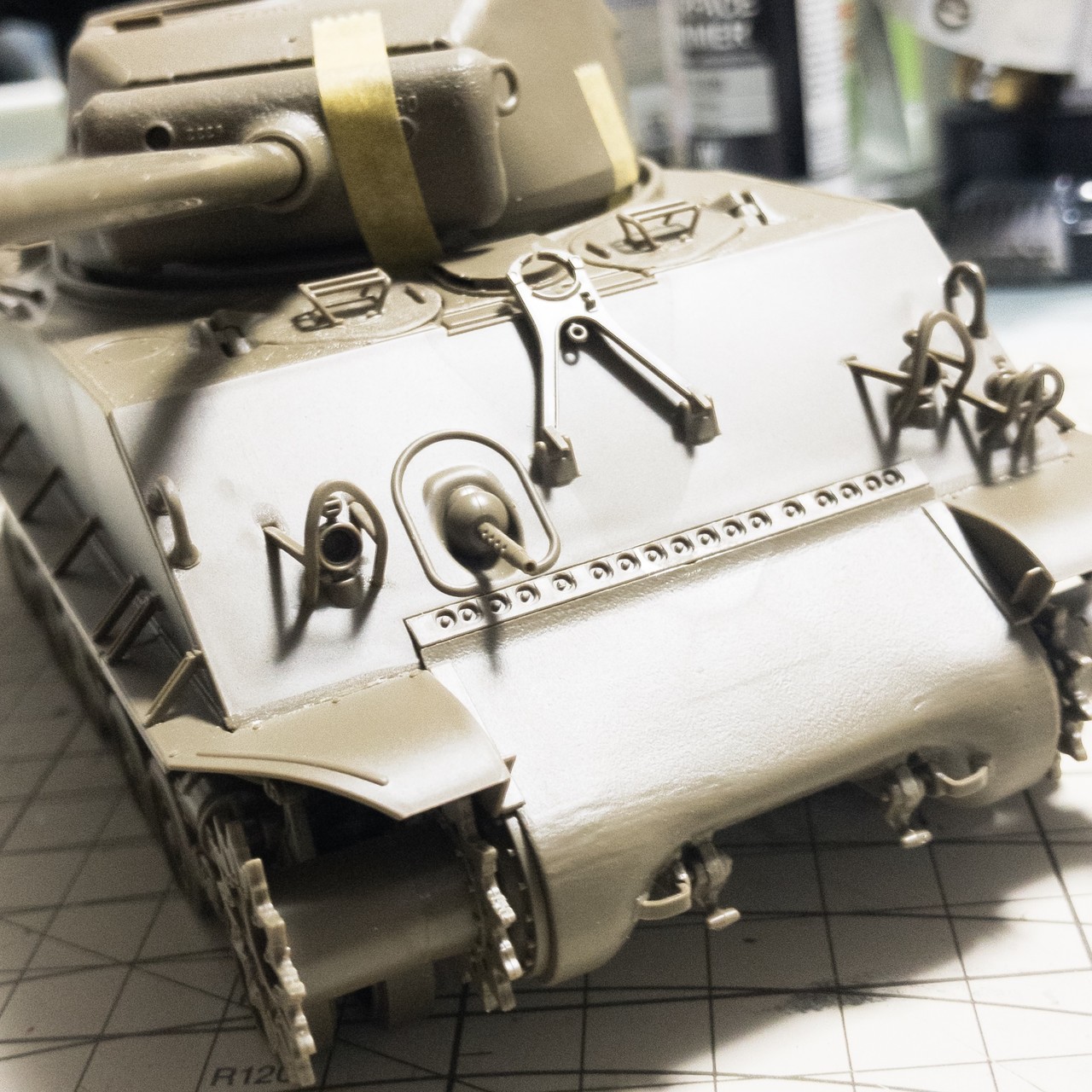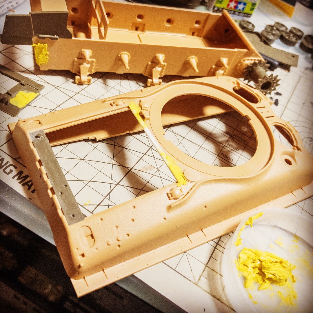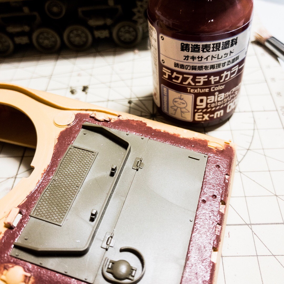 M4A1E8的シャーマン。プラ板やポリパテ使った部分にガイアノーツの鋳造表現塗料を塗ってみました。元々の鋳造モールドと馴染むかどうかはプライマー吹いてみないとよくわかんないですね😅