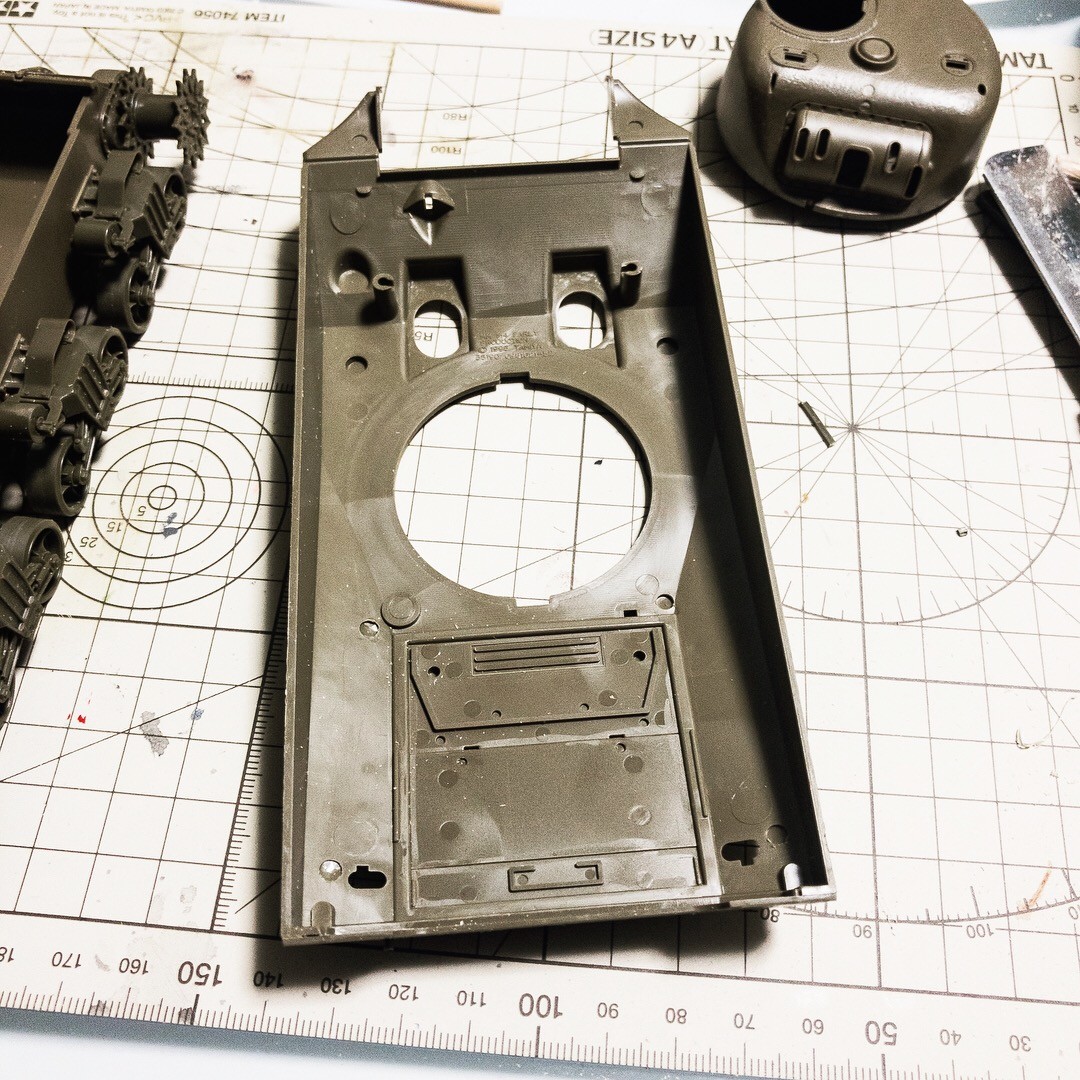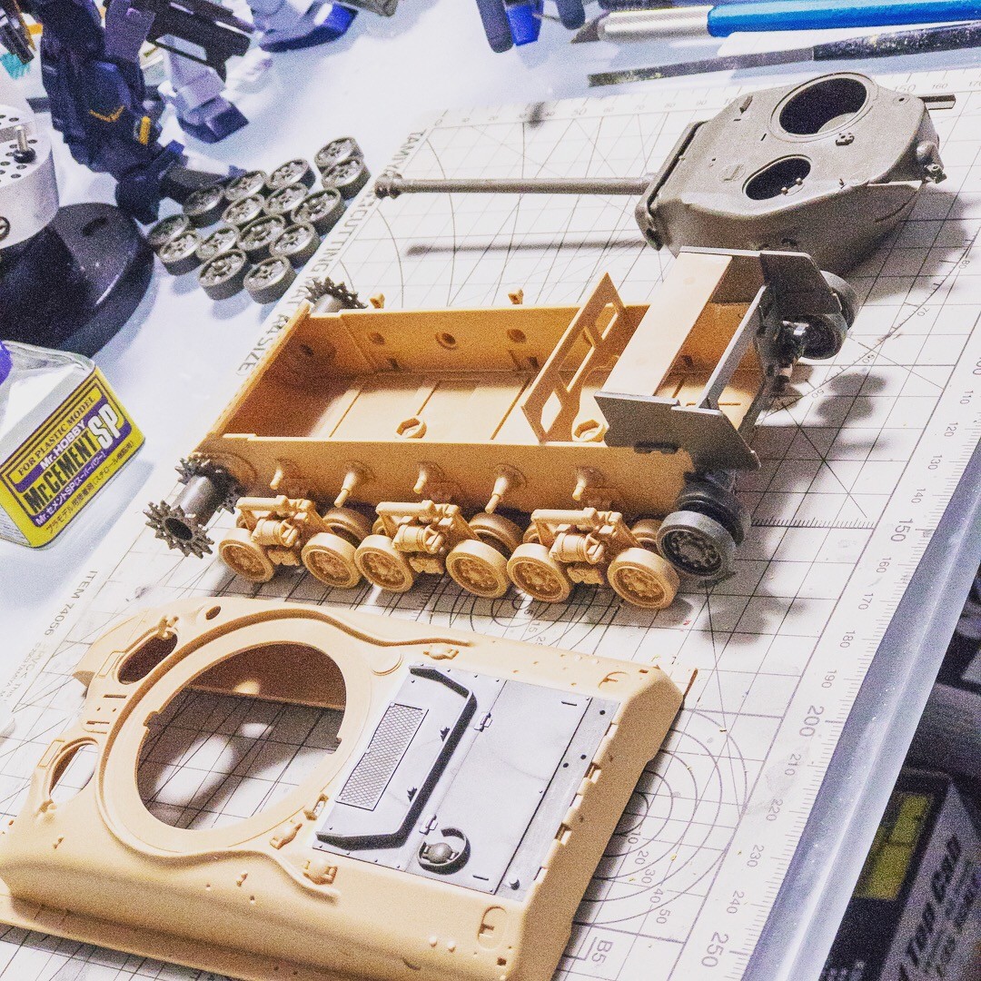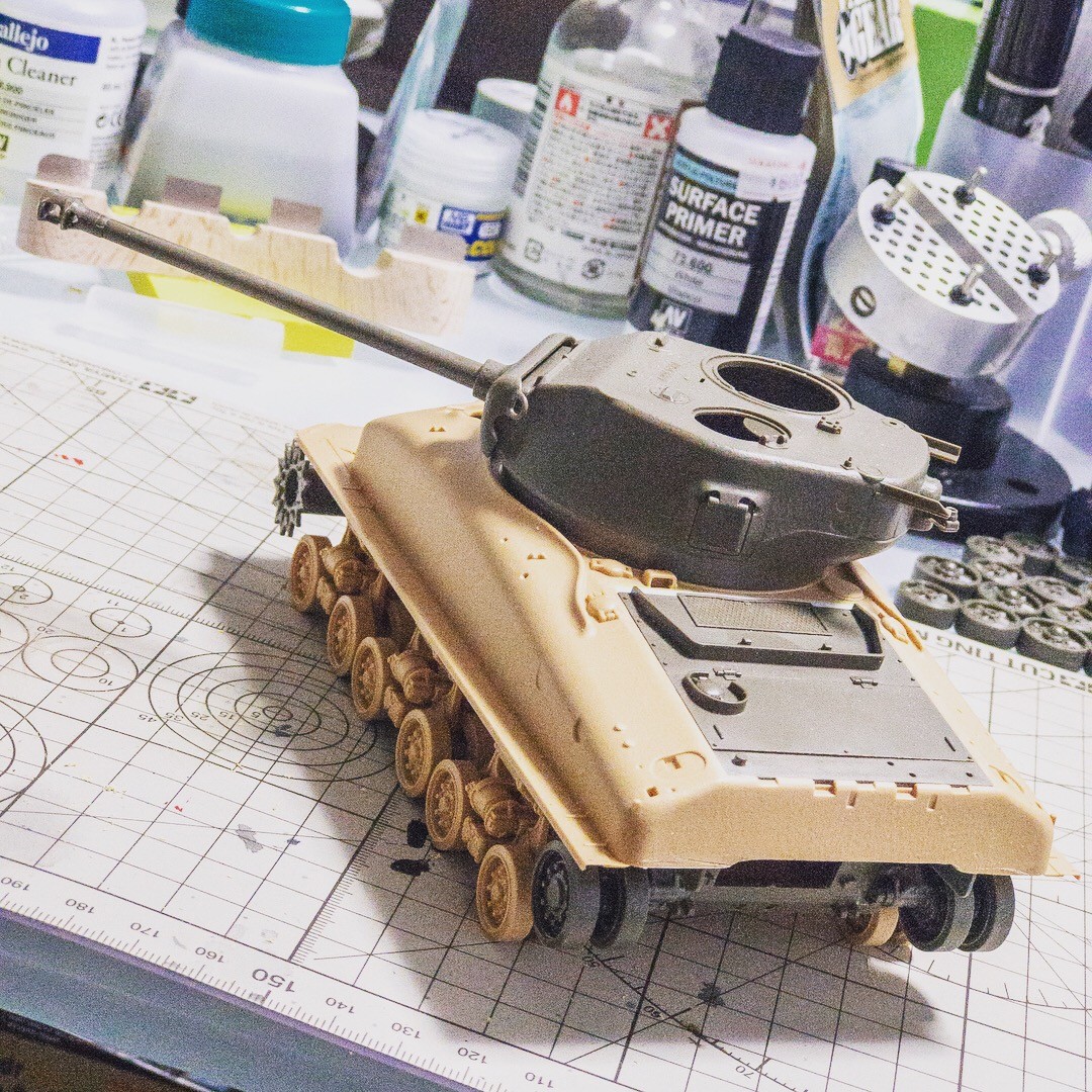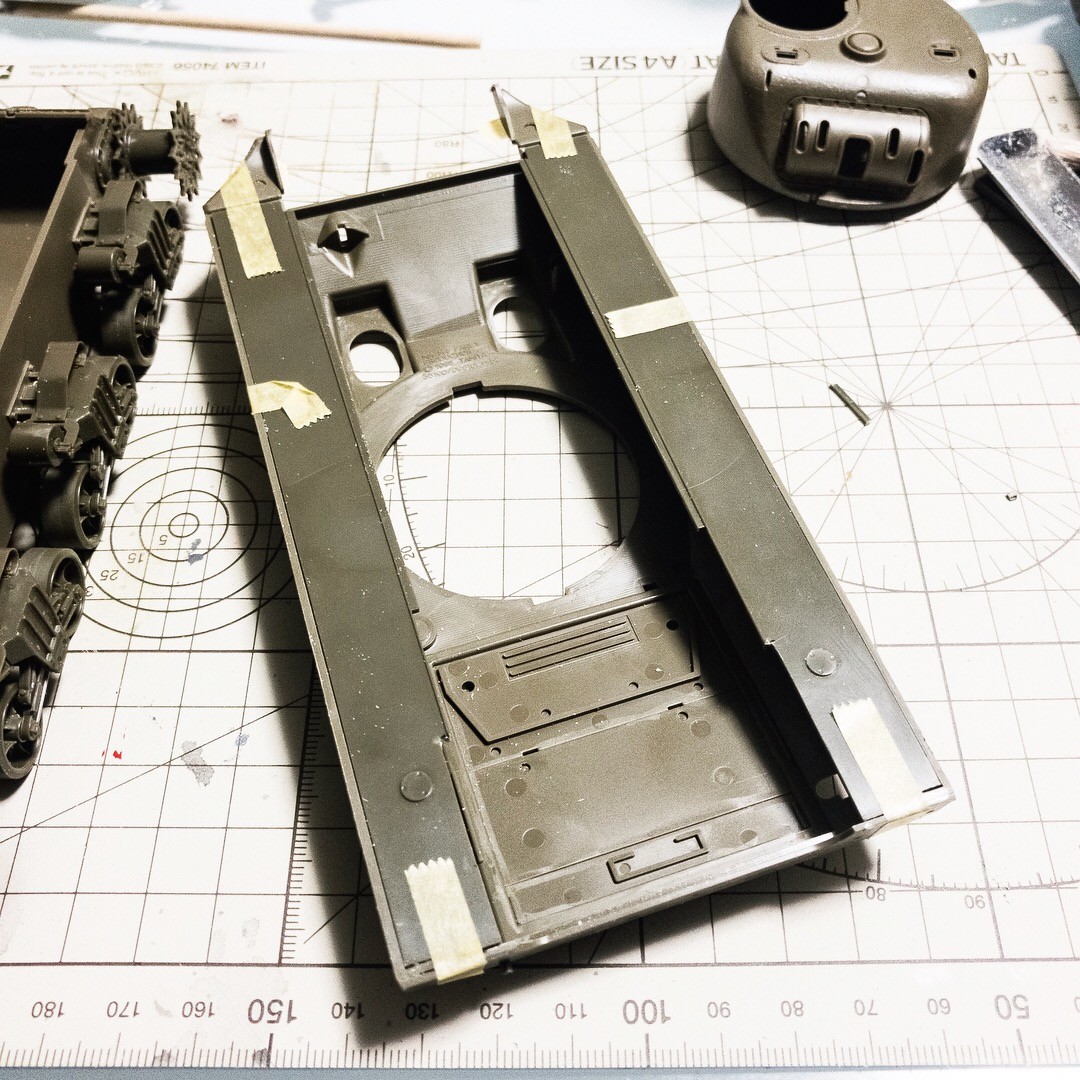タミヤ M4A3E8あと1パーツ接着すればプライマー吹ける状態かな〜時空を超えたパーツが帰還しないので注文する事になりプライマーはお預けです😂