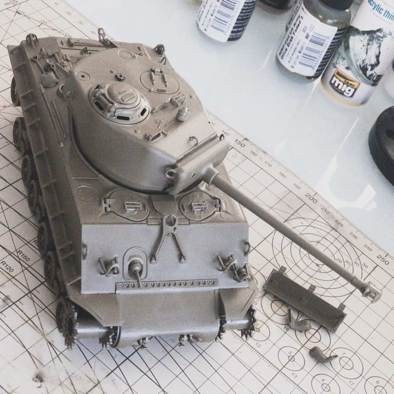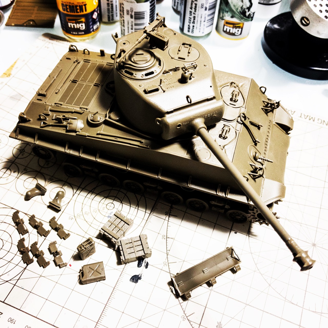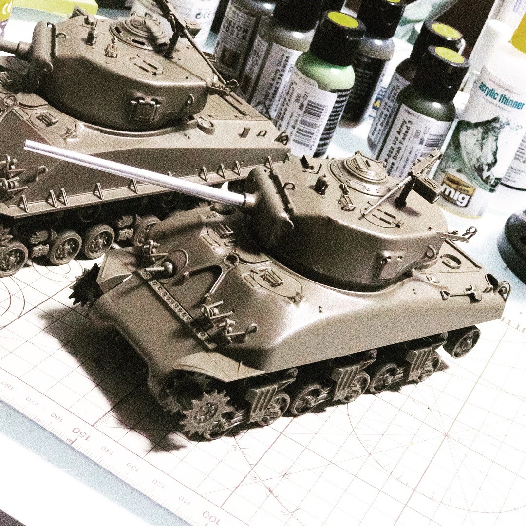 タミヤ M4A3E8車体本体色で塗るパーツは着けたかな...思ったより小さい部品が多くて時間掛かった...⚒🔨⛓🔩🔧