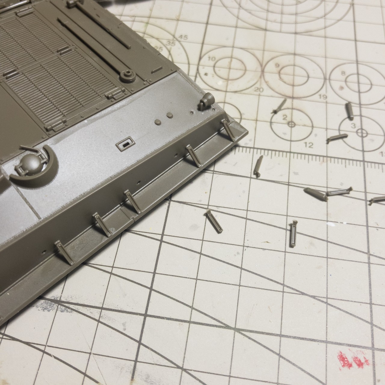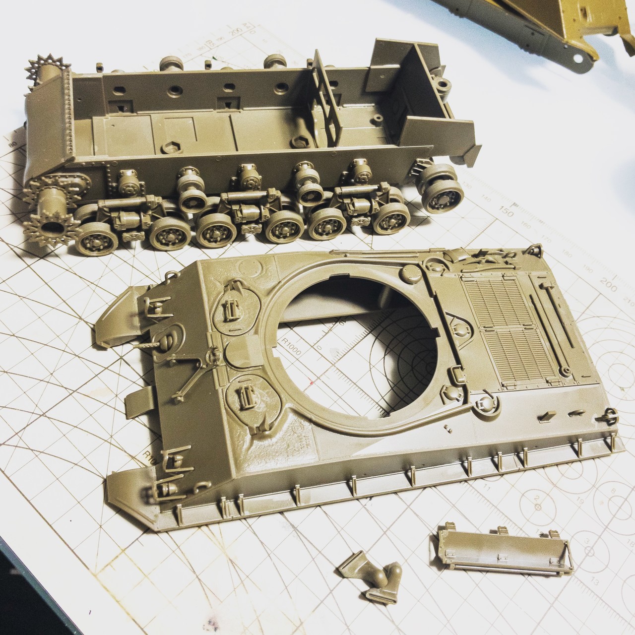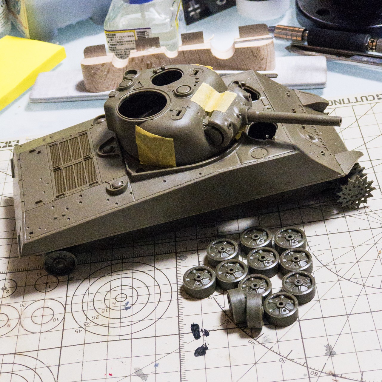 タミヤ M4A3E8車体本体色で塗るパーツは着けたかな...思ったより小さい部品が多くて時間掛かった...⚒🔨⛓🔩🔧