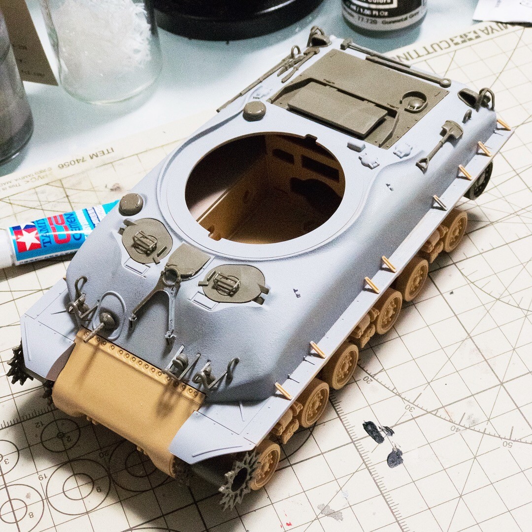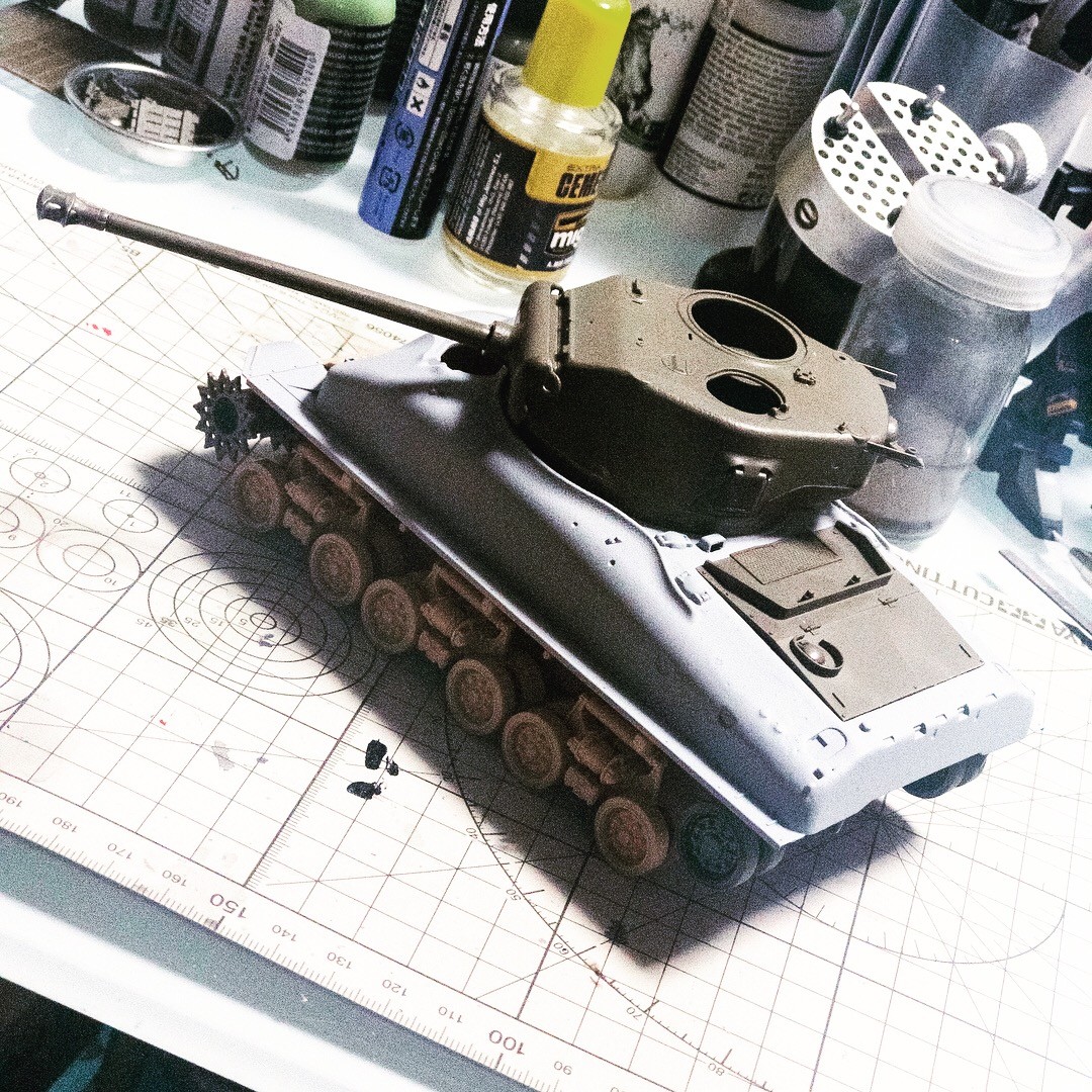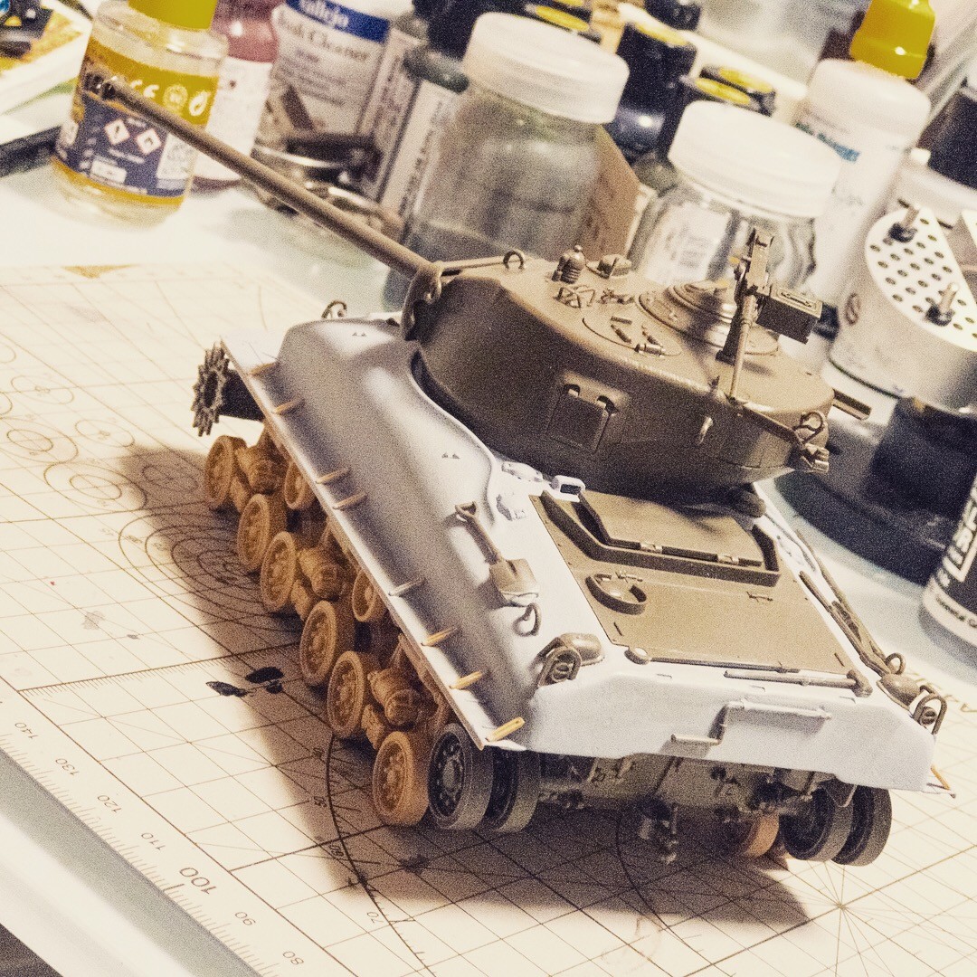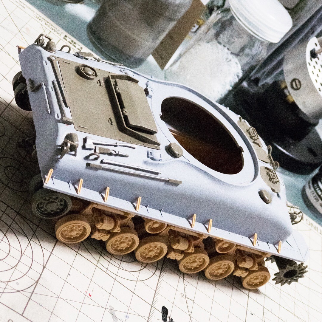 タミヤM51から先祖返りさせたM4A1E8的なシャーマン。車体上面の改造箇所の継ぎ目埋めして鋳造塗料塗って、プライマー吹きました。まあまあかな...🤔