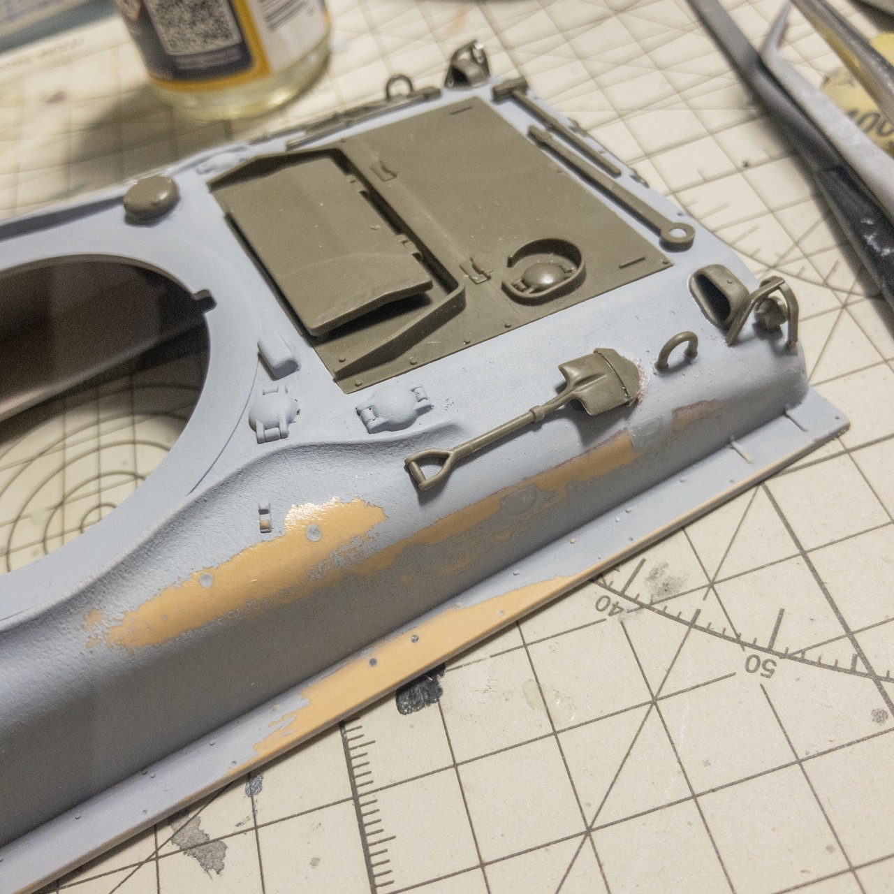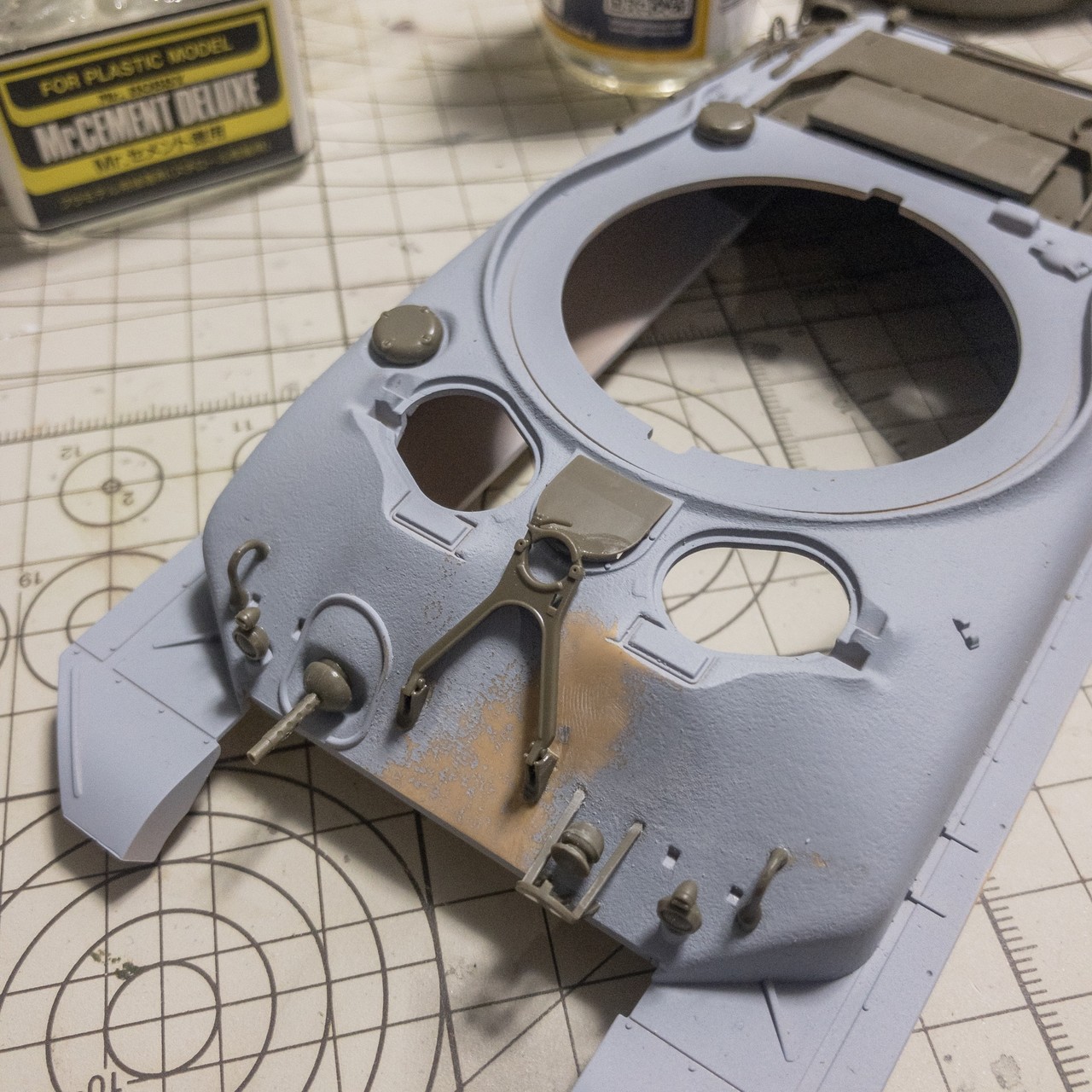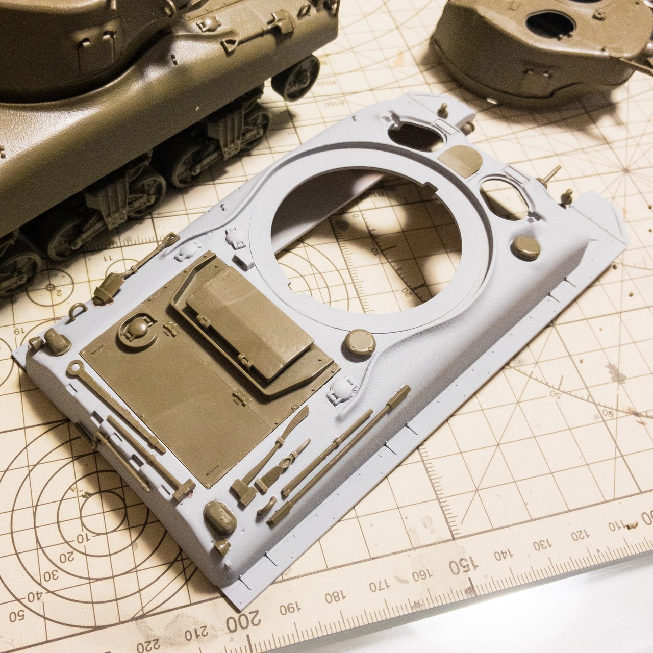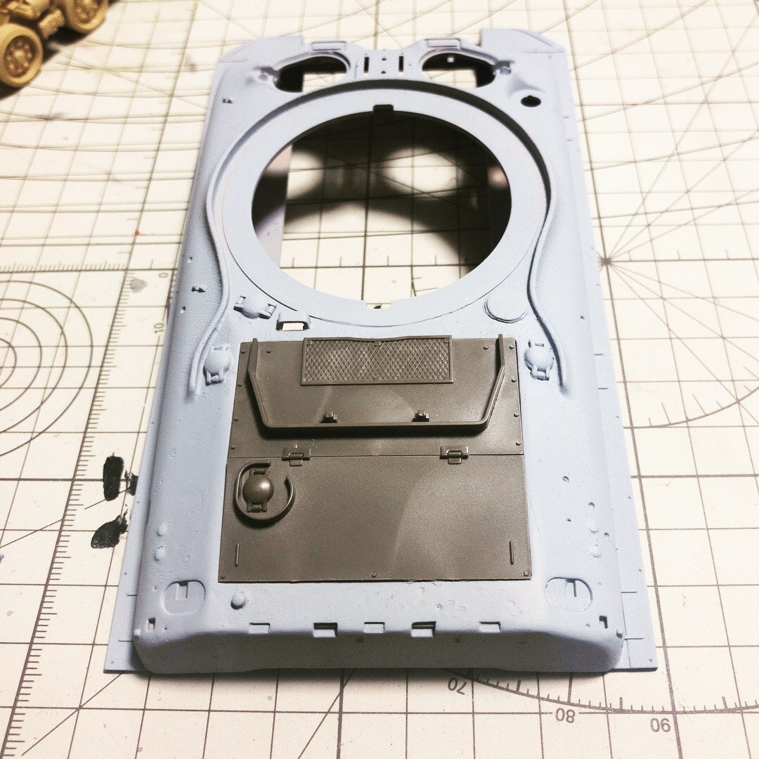 タミヤM51から先祖返りさせたM4A1E8的なシャーマン。車体上面の改造箇所の継ぎ目埋めして鋳造塗料塗って、プライマー吹きました。まあまあかな...🤔