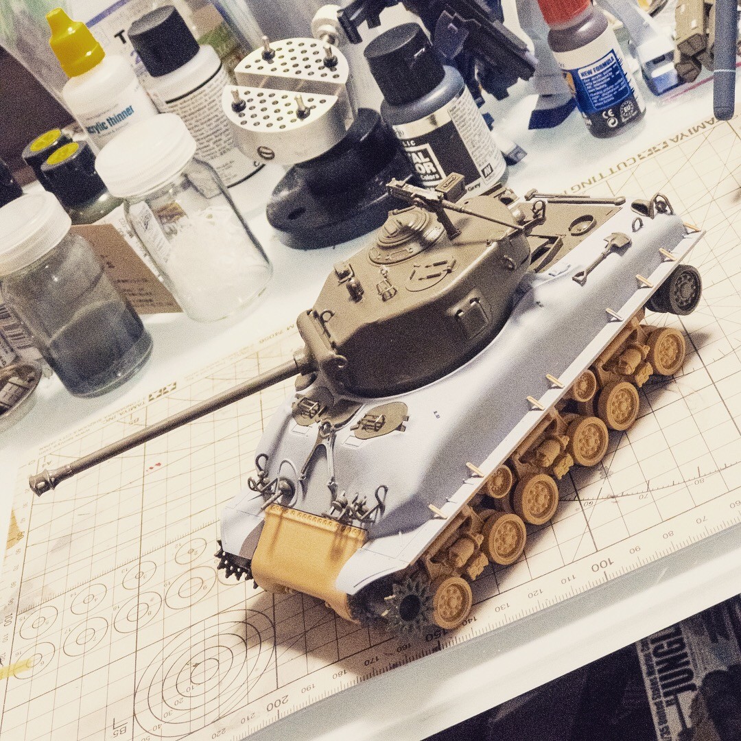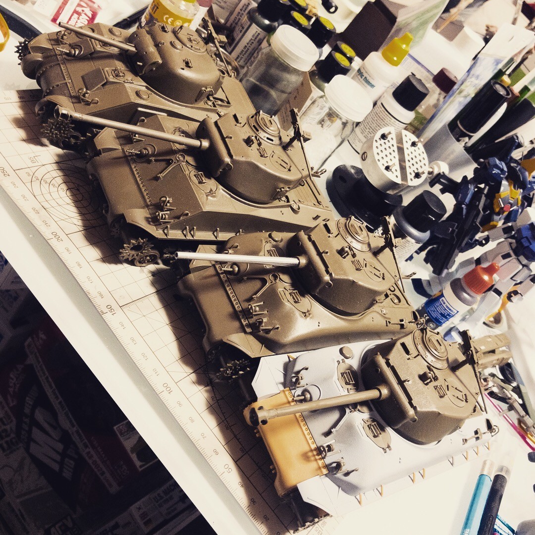 M51スーパーシャーマンをM4A1E8的に改造してた個体だいたい完成。7台同時製作のうち4台ができました。折返し地点😅せめて1台はお正月休みに完成させたい...😆