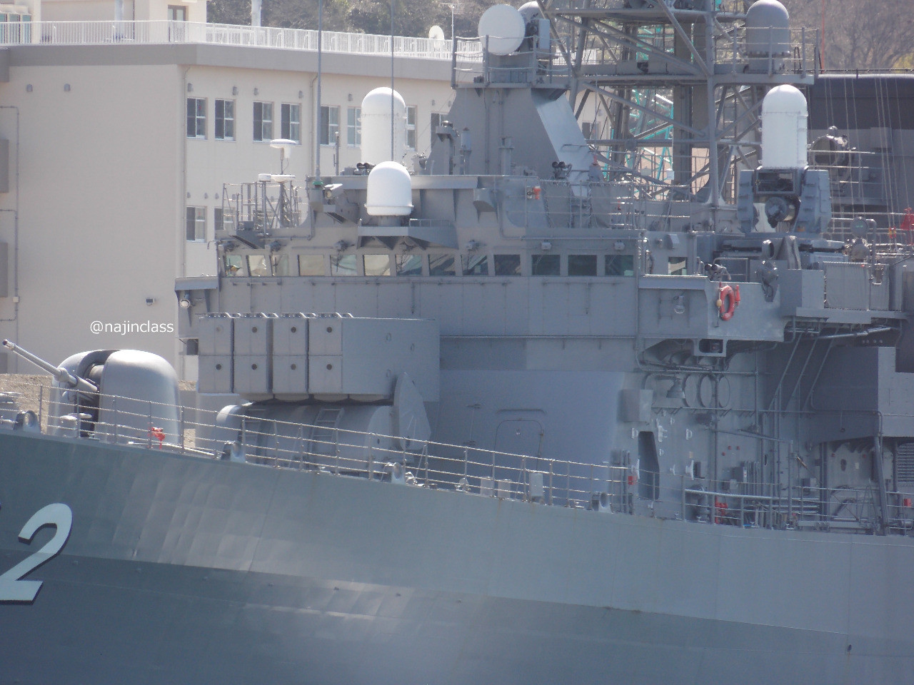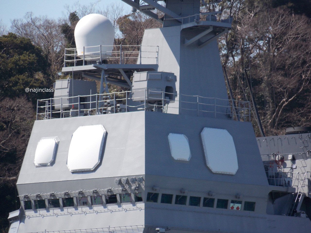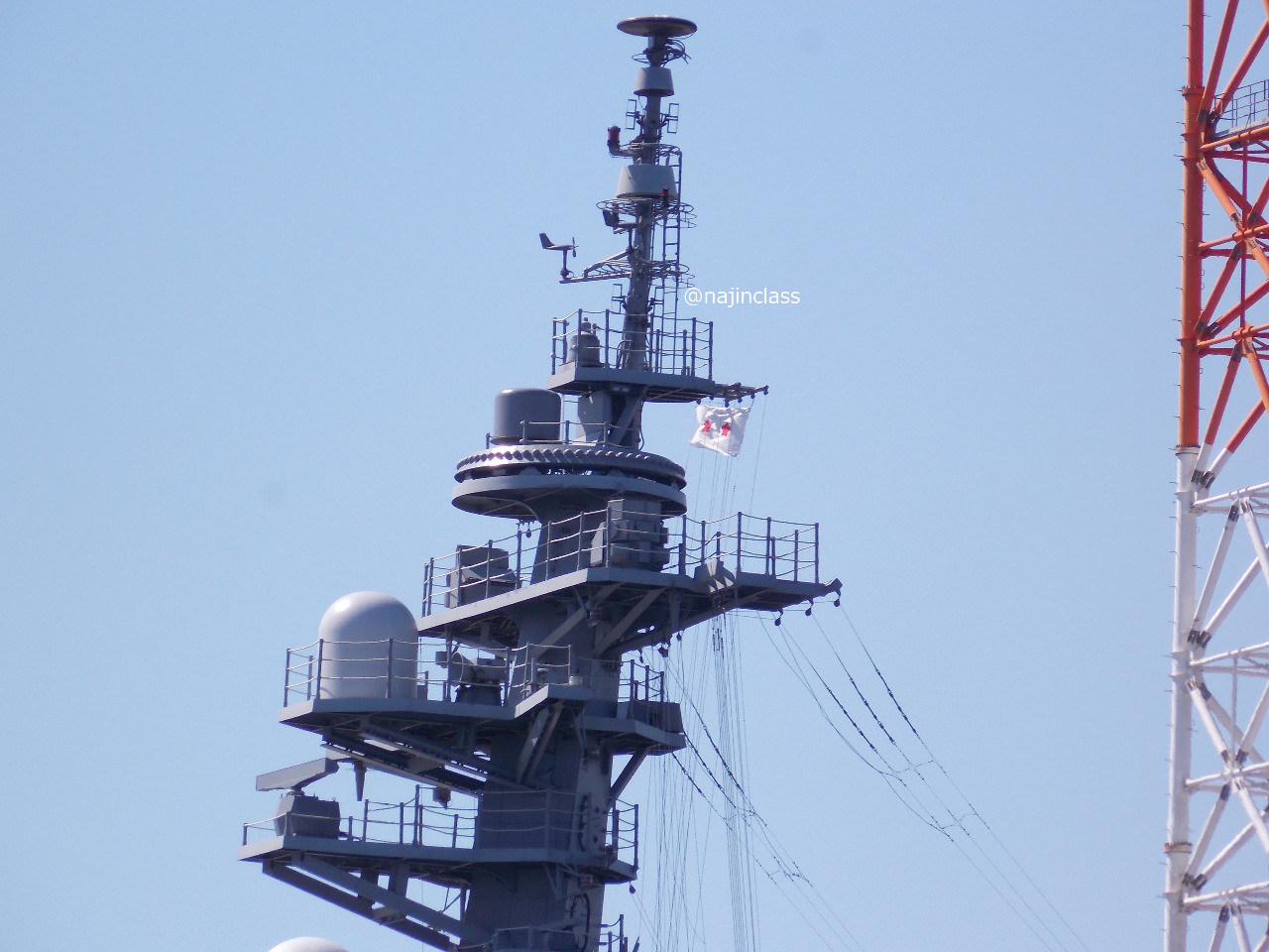 長距離通信アンテナとかマストとかFCS-3の多機能レーダーなど。 (海将補旗が掲揚されていました。)